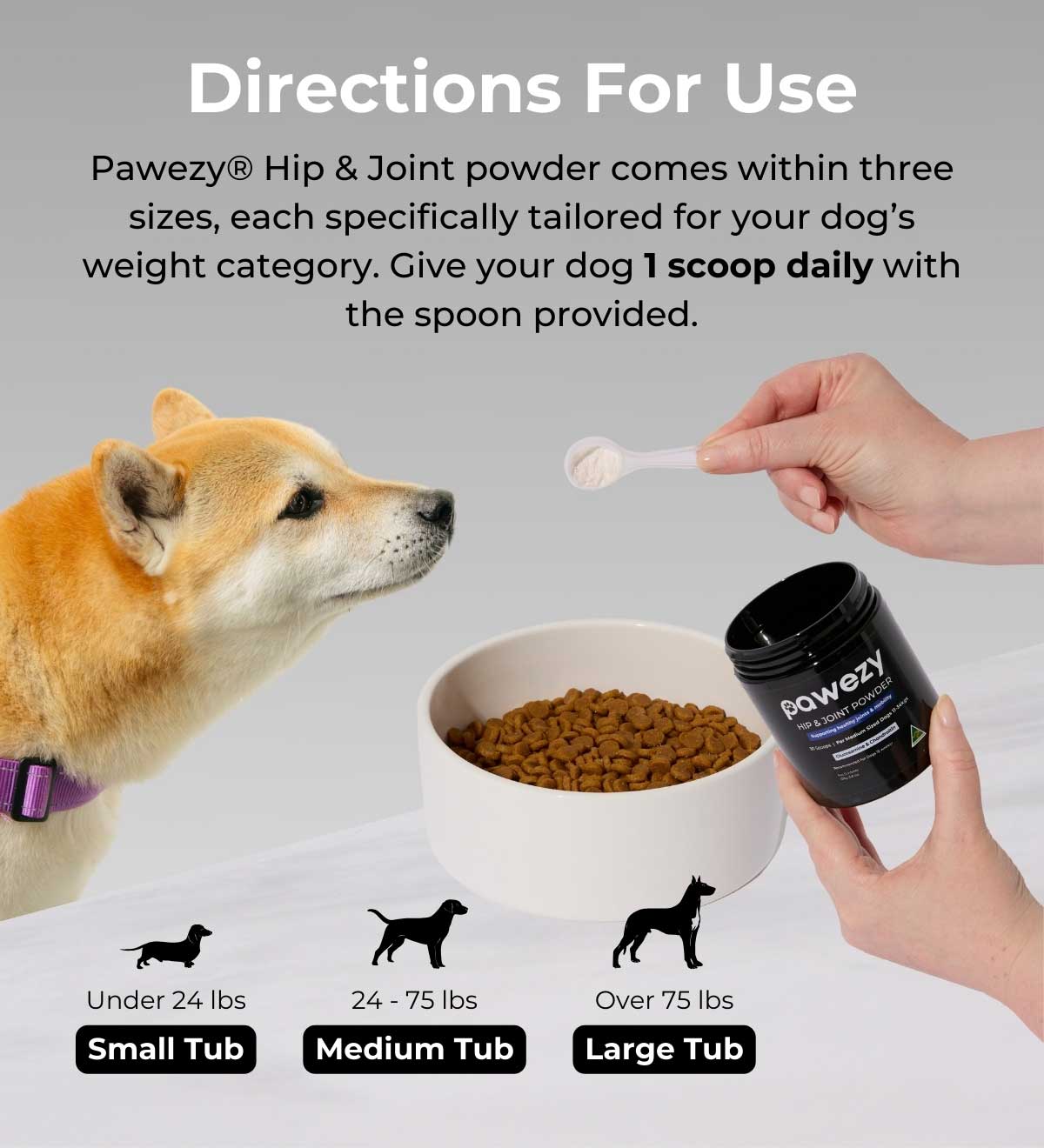 Each tub contains 30 daily servings. Give 1 scoop per day — the scoop size and tub are tailored to your dog’s weight.